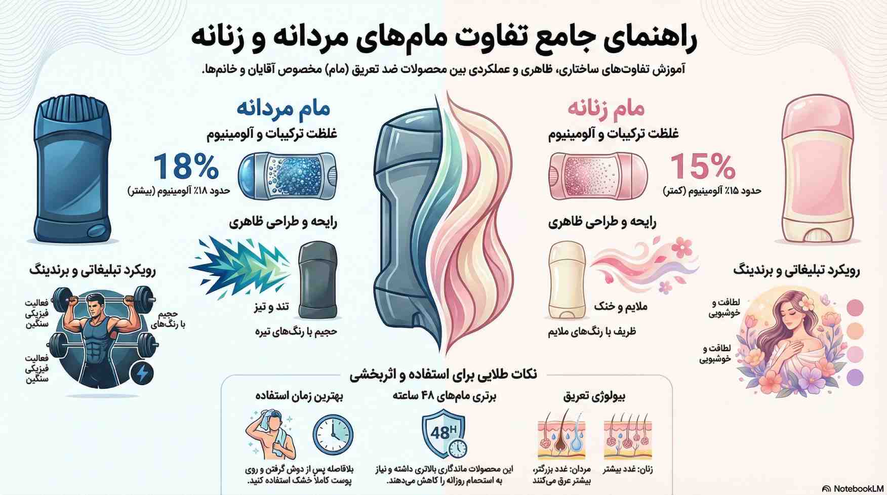 با توجه به اینکه تعداد غدد تولید عرق در خانم ها نسبت به آقایان کمی بیشتر است، شرکتهایی که در زمینه تولید لوازم بهداشتی همچون مام فعالیت دارند نیز تغییراتی در فرمول ساخت محصولات خود با توجه به نوع جنسیت فرد مصرف کننده میدهند. البته باید اشاره کنیم که غدد تولید عرق در آقایان بزرگتر از خانمها است، پس به همین دلیل است که تعداد بیشتر این غدد در خانمها تاثیری در تعریق بیشتر آنها نسبت به آقایان ندارد و مردها نسبت به زنها بیشتر عرق میکنند. با توجه به این موضوع به تفاوت مام مردانه و زنانه در ادامه اشاره شده است.