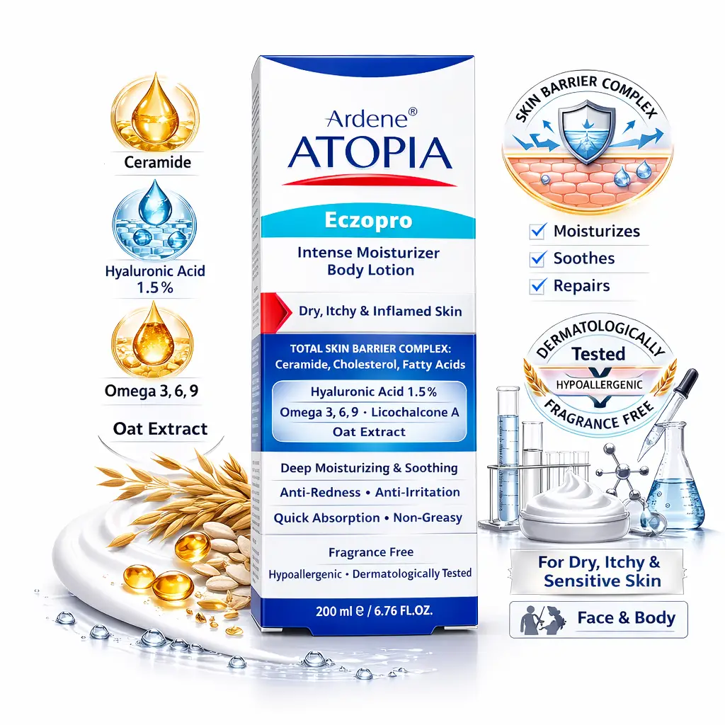لوسیون بدن آردن ATOPIA Eczopro Intense Moisturizer یک مرطوبکننده تخصصی برای پوستهای خشک، ملتهب و مستعد خارش است که با تمرکز بر تقویت سد دفاعی پوست طراحی شده است. این محصول با ترکیبات بازسازیکننده شامل سرامید، کلسترول و اسیدهای چرب، به ترمیم لایه محافظ پوست کمک کرده و از تبخیر رطوبت جلوگیری میکند. وجود هیالورونیک اسید، امگا 3، 6 و 9 و عصاره جو دوسر، باعث آبرسانی عمیق، تسکین التهاب و کاهش خارش میشود. این لوسیون فاقد عطر بوده و با حداقل ریسک بروز حساسیت، گزینهای حرفهای برای مراقبت روزانه از پوستهای بسیار خشک و حساس محسوب میشود.