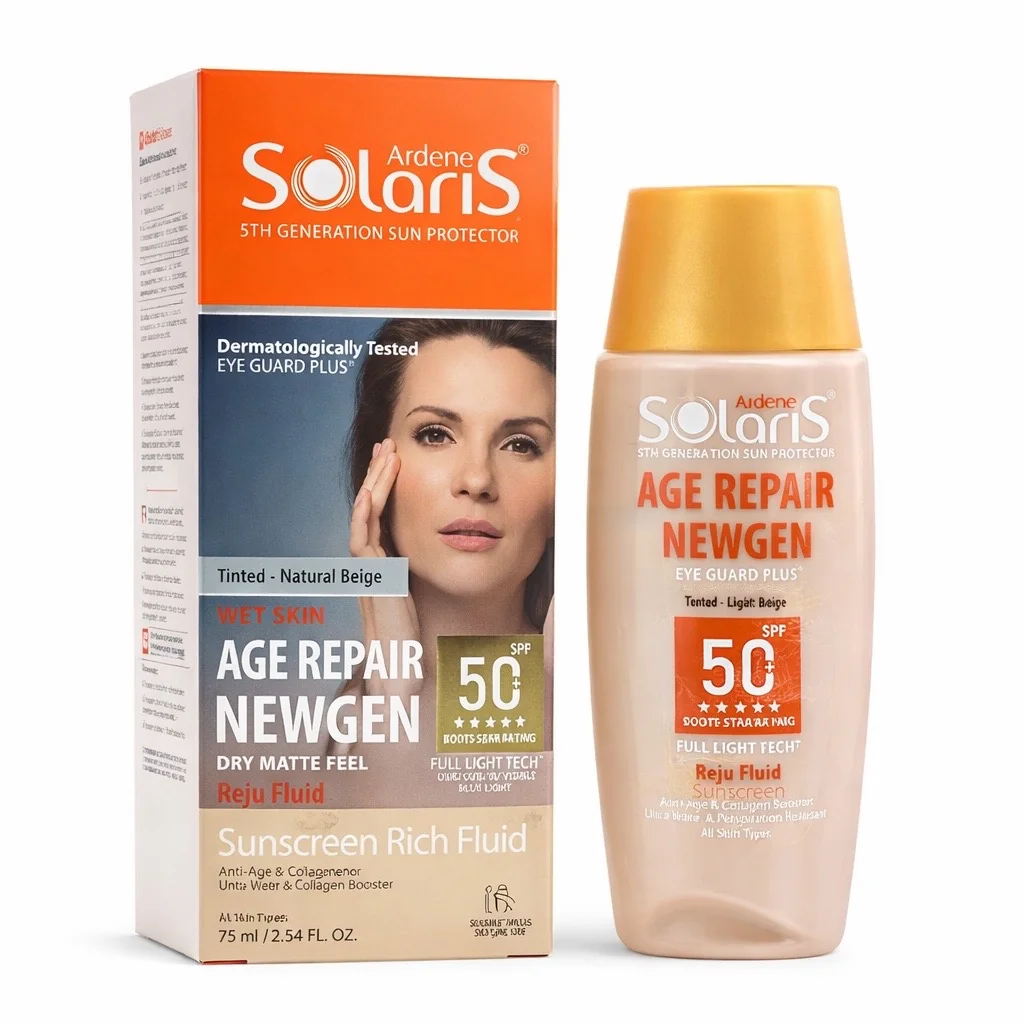 فلوئید ضدآفتاب رنگی آردن سولاریس Age Repair NewGen SPF50 یک ضدآفتاب نسل پنجم با عملکرد دوگانه محافظتی و مراقبتی است که علاوه بر محافظت کامل از پوست، به بهبود ظاهر خطوط و نشانههای اولیه افزایش سن کمک میکند. این محصول با تکنولوژی پیشرفته Full Light Tech از پوست در برابر اشعههای UVA، UVB، نور مرئی و نور آبی محافظت کرده و در عین حال با داشتن رنگ Natural Beige، جلوهای یکدست، طبیعی و مات روی پوست ایجاد میکند. بافت ریچ فلوئید آن ضمن حفظ سبکی و جذب سریع، حس لطافت و نرمی ماندگاری روی پوست باقی میگذارد و انتخابی حرفهای برای استفاده روزانه محسوب میشود.