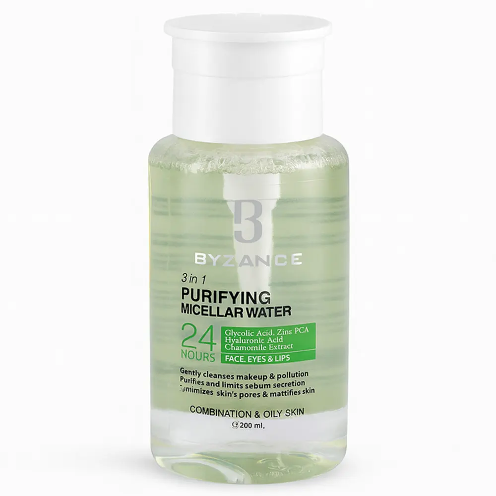 فرمولاسیون این میسلار واتر با ترکیبات کنترلکننده چربی و ضد التهاب، به کاهش براقیت پوست، جمع شدن منافذ باز و پیشگیری از ایجاد جوش و آکنه کمک مینماید. وجود زینک PCA، اسید هیالورونیک و عصاره بابونه باعث میشود پوست پس از پاکسازی، دچار خشکی یا تحریک نشود و حس طراوت، نرمی و تعادل چربی را تجربه کند. محلول پاککننده آرایش پوست چرب بیزانس فاقد الکل بوده و تحت لیسانس فرانسه تولید شده است و گزینهای ایدهآل برای استفاده روزانه پوستهای چرب و مختلط محسوب میشود.