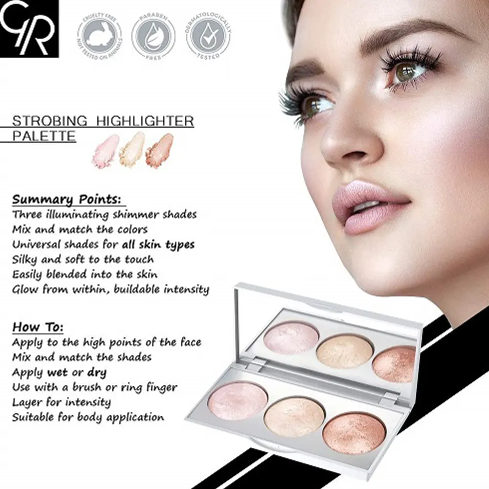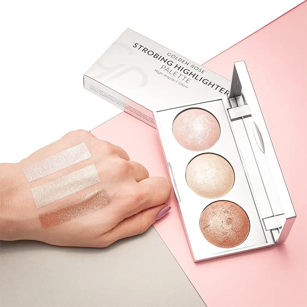 پالت هایلایتر گلدن رز مدل Strobing یک مجموعه سهتایی از پودرهای درخشان و چندکاره است که برای ایجاد بُعد، برجستگی و جلوهای شفاف روی پوست طراحی شده است. این پالت شامل سه رنگ براق با تناژهای صورتی، طلایی و برنزه بوده که با انواع رنگ پوست هماهنگ میشود و امکان خلق درخشش طبیعی تا جلوهای پررنگتر و حرفهای را فراهم میکند.