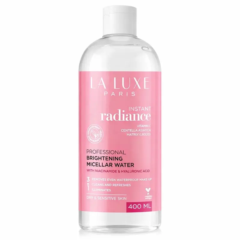 میسلار واتر روشنکننده لا لوکس پاریس Instant Radiance حجم 400 میل یک پاککنندهی حرفهای و چندکاره برای پوستهای کدر، حساس و بیحال است که بدون ایجاد خشکی یا تحریک، آرایش و آلودگیهای روزانه را بهطور کامل از روی پوست پاک میکند.این میسلار واتر با بهرهگیری از ترکیبات مؤثر روشنکننده و آبرسان، علاوهبر پاکسازی، به شفافتر شدن پوست کمک کرده و احساس طراوت و تازگی را به پوست بازمیگرداند. فرمولاسیون ملایم آن، این محصول را به انتخابی ایدهآل برای استفادهی روزانه حتی روی پوستهای حساس تبدیل کرده است.