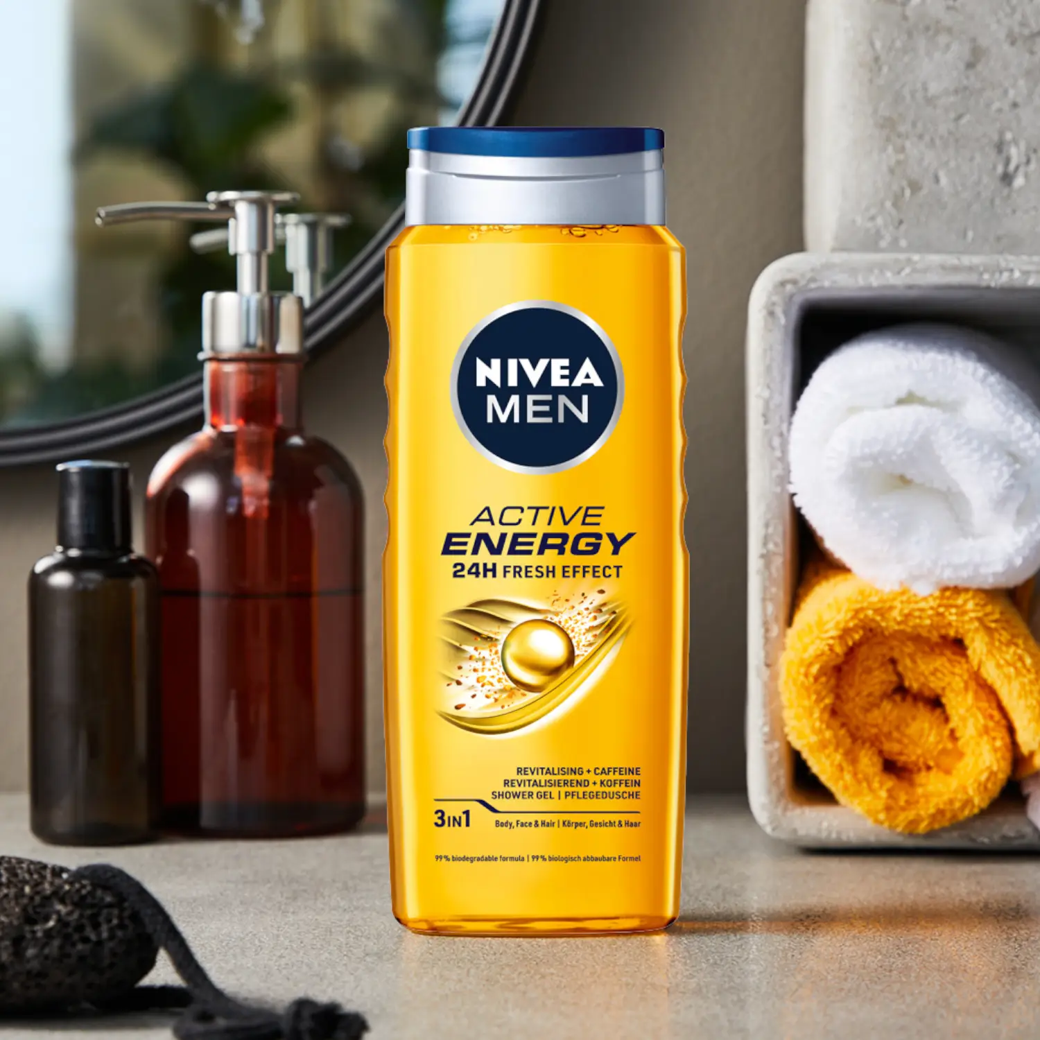 ژل شستشوی نیوآ Nivea Men Active Energy یک شوینده 3در1 برای بدن، صورت و مو است که با فرمول حاوی کافئین، به پوست و مو انرژی میبخشد و حس شادابی 24 ساعته ایجاد میکند. این محصول با بافت سبک، کف مناسب و شستشوی راحت، برای آقایانی طراحی شده که یک محصول کامل و کاربردی در روتین روزانه خود میخواهند.