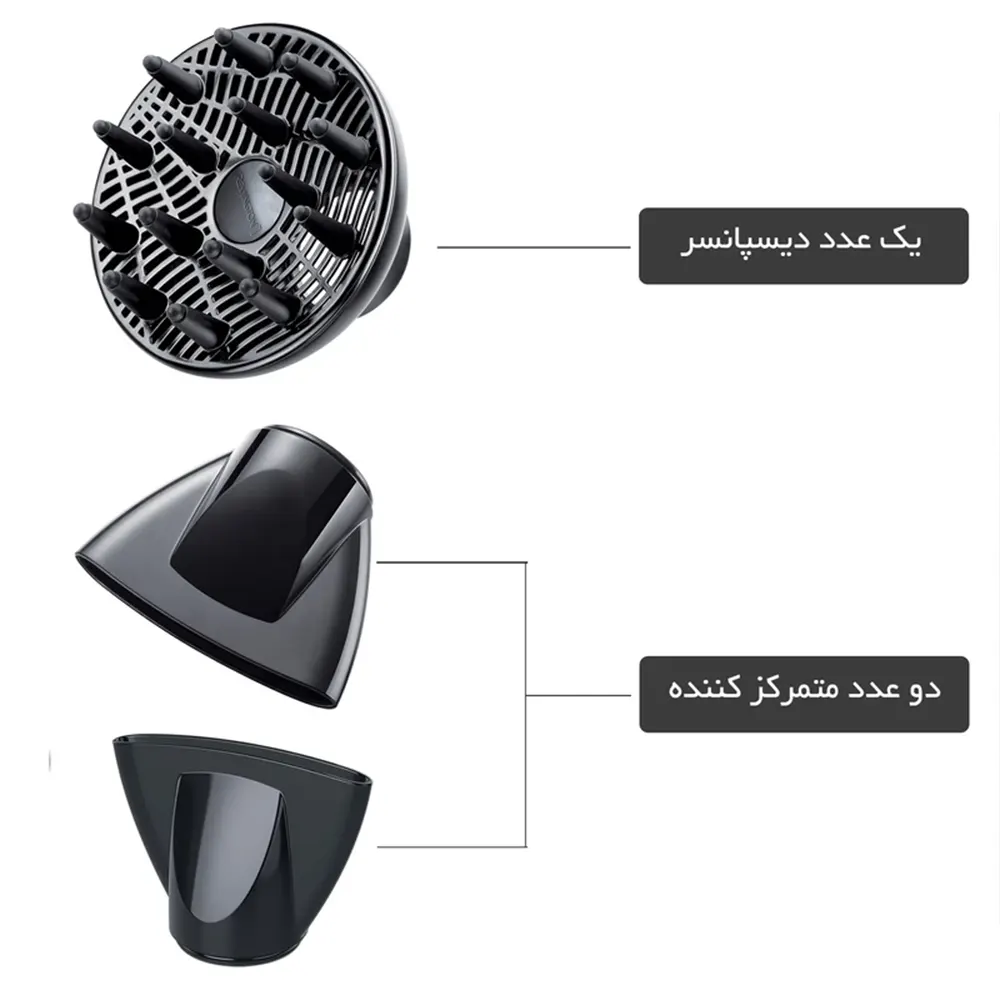 ساختار بدنه از جنس پلاستیک مرغوب و طراحی ارگونومیک این دستگاه باعث میشود کار با آن طولانیمدت و بدون خستگی باشد. ۳ وضعیت حرارتی و ۲ حالت سرعت باد به همراه عملکرد توربو (افزایش سرعت دمش هوا تا ۱۰٪) انعطافپذیری بالایی در تنظیم حالتدهی به مو ارائه میکند. دو سری متمرکزکننده همراه سشوار نیز کمک میکند تا حجمدهی، صافکردن و براشینگ حرفهای را بهسادگی انجام دهید.
