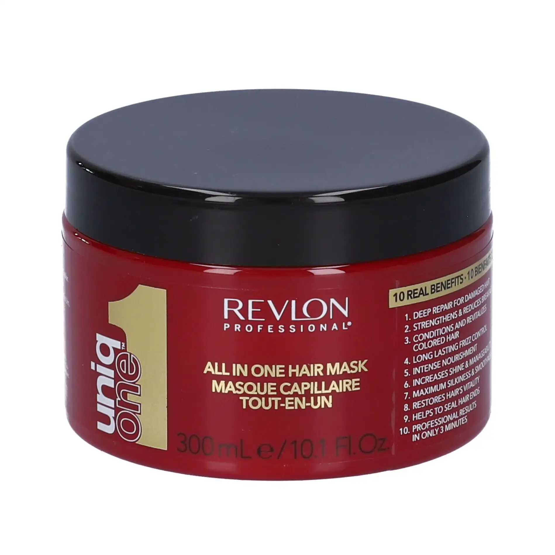 ماسک مو رولون revlon ده کاره داخل حمام مدل یونیک وان Uniq One حجم 300 میل، موها را به صورت عمقی آبرسانی ، تغذیه و ترمیم کرده و از ایجاد موخوره و دوشاخه شدن تار موها جلوگیری کرده و با فرمولاسیون ویژه خود ضمن تقویت ریشه و ساقه موها، باعث ایجاد طراوت و شادابی موها شده و خاصیت نرم کنندگی و ضد شکنندگی برای مو داشته و همچنین ایجاد و حفظ خاصیت ارتجاعی و کشسانی مو ، از دیگر خواص معجزه آسای این محصول می باشد.