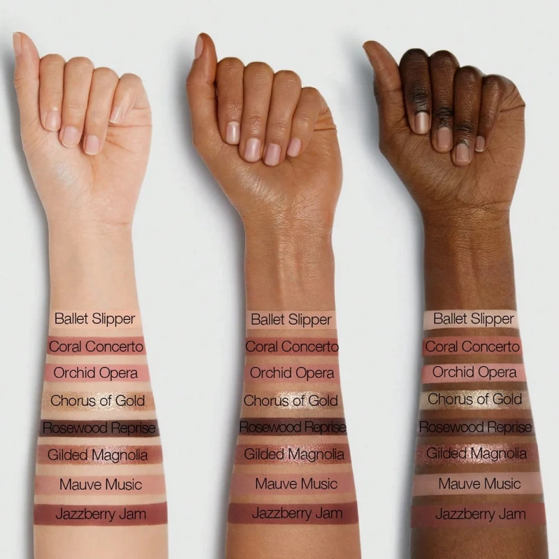 این پالت شامل ۸ رنگ متنوع با جلوههای مات، شایندار و گلیتری است که بافتی نرم، سبک و کاملاً قابلفید دارند. وجود رنگهای کرم، نخودی، صورتی، بژ روشن، قهوهای و آجری باعث میشود این پالت برای انواع تناژ پوست و رنگ چشم مناسب باشد.