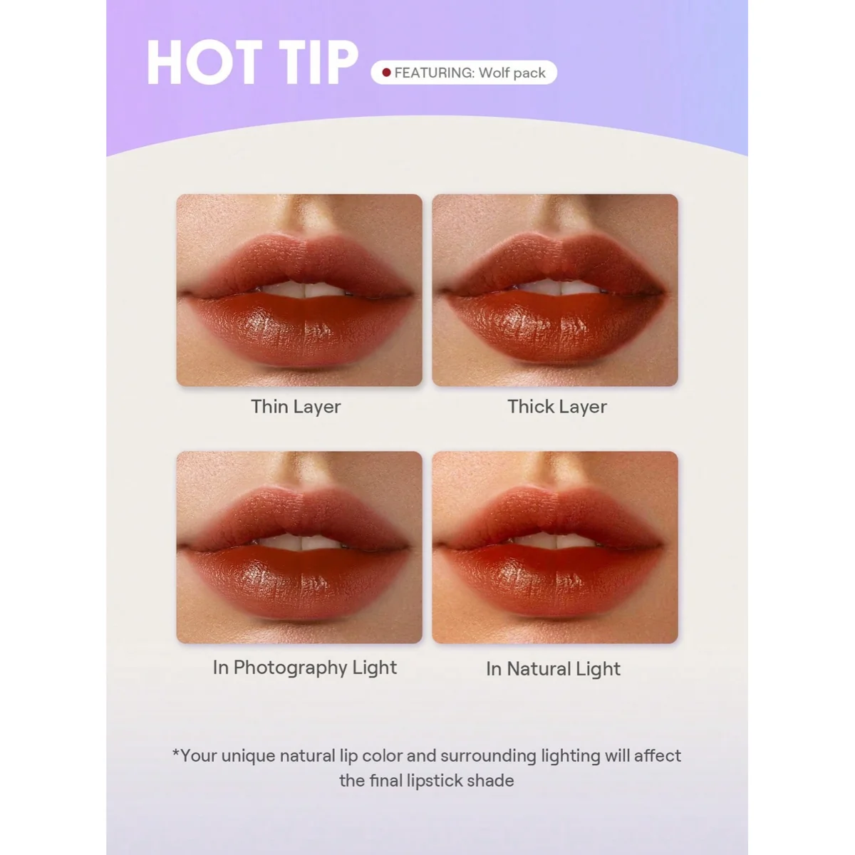 نکتهی جذاب این رژ لب این است که با تغییر ضخامت لایه و نوع نور (نور طبیعی یا نور عکاسی)، جلوهی رنگ میتواند متفاوت دیده شود؛ بنابراین میتوانید با یک محصول، چند استایل خروجی بگیرید.